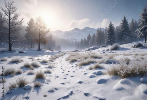Frosty landscape with snowflakes falling from the sky , landscape, snowfall