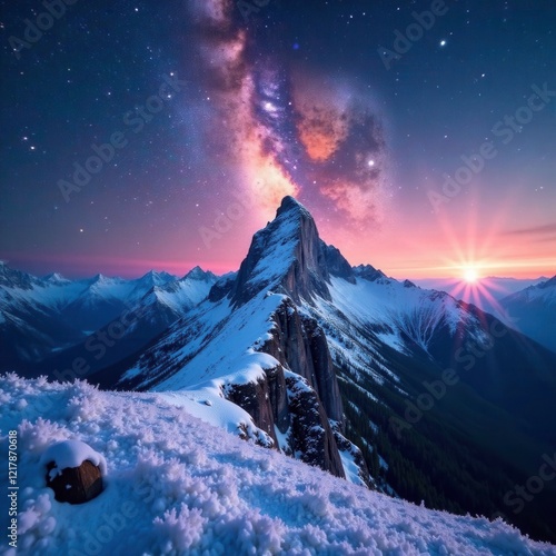 Frosty morning on a mountain peak as the Milky Way glows above, landscape, serene, mountain
