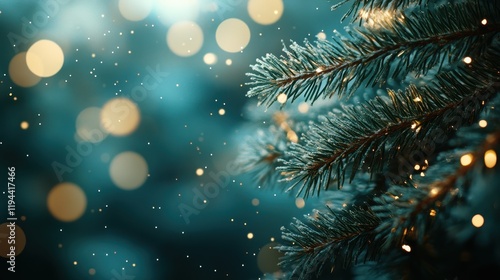 Frosty pine branches with twinkling lights in a winter wonderland scene