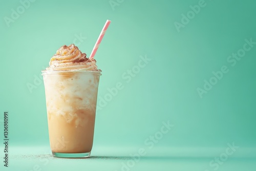 Frothy Iced Drink with Whipped Cream and Pink Straw on blue