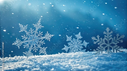 Frozen beauty: a stunning snowscape of falling snowflakes against a vibrant blue winter sky.
