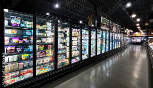 Frozen Food Displays: Aisle of Ice Cream, Frozen Meals, and Snacks in Supermarket Freezers