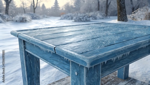 Frozen rustic wooden table; winter wonderland scene; icy surface; serene, cold mood.