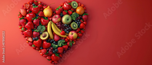 Fruit and vegetable heart shapes on a light red background, concept of healthy eating or dieting for good health with copy space