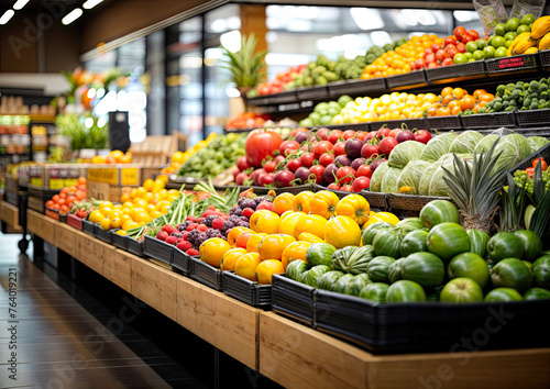 Fruits and vegetables on the shelves of a grocery store or supermarket