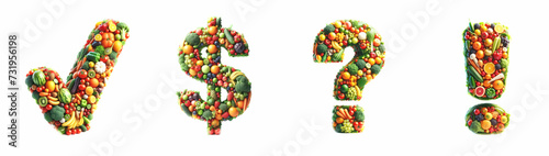 Fruits and Vegetables set - SPECIAL CHARACTERS check mark - $ - ? - ! . 3D isolated on a white background. Diet concept art. Healthy food. Organic fruits and veggies. Special characters and symbols