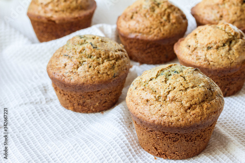 Fruity muffins made with stone ground flour on white kitchen cloth with space for text
