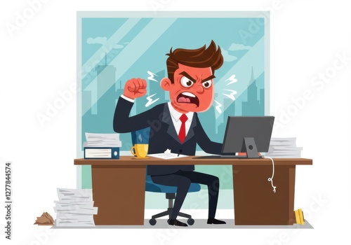Frustrated businessman yelling at laptop in office surrounded by paperwork