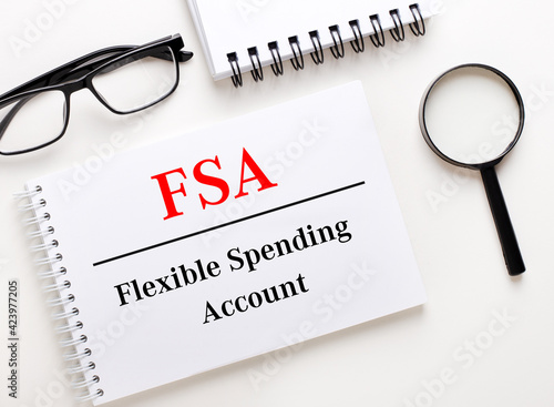 FSA Flexible Spending Account is written in a white notebook on a light background near the notebook, black-framed glasses and a magnifying glass.