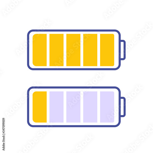Full and empty battery charge design on an isolated white background. The concept of emotional burnout. Flat style. Icon for site applications, print on fabric and clothes. Vector stock graphic.