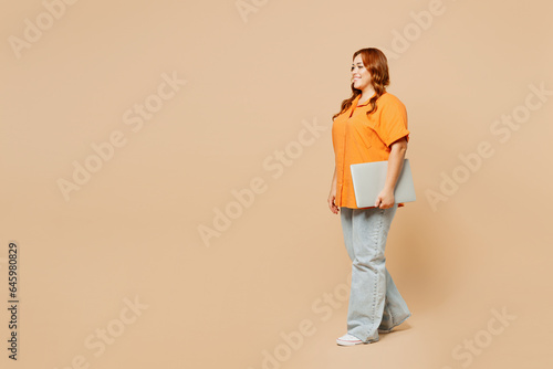 Full body side profile view young ginger chubby overweight woman in orange shirt casual clothes hold closed laptop pc computer walk go isolated on plain pastel light beige background studio portrait