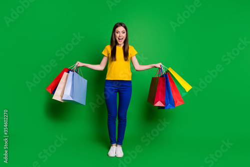 Full length body size view portrait of her she nice attractive lovely fashionable cheerful slim fit thin girl holding in hands new clothes isolated bright vivid shine vibrant green color background