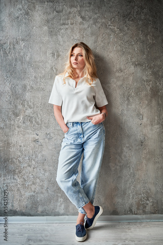 Full length of woman in casual clothes standing by the wall in new apartment. Female person keeping hands in jeans pockets..