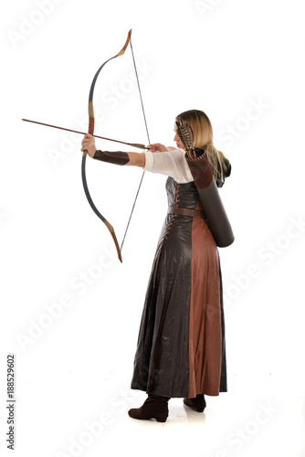 full length portrait of girl wearing brown fantasy costume, holding a bow and arrow, on white studio background.