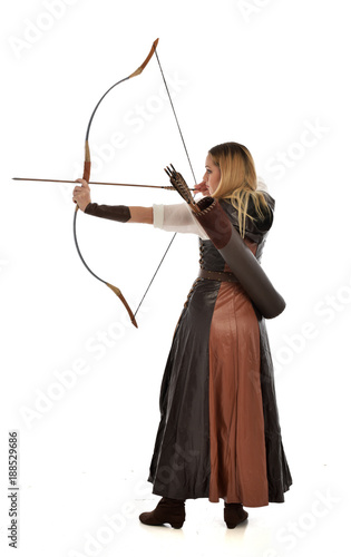 full length portrait of girl wearing brown fantasy costume, holding a bow and arrow, on white studio background.