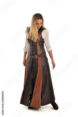 full length portrait of girl wearing brown fantasy costume. standing pose on white studio background.