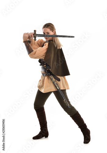 full length portrait of girl wearing brown medieval costume,. standing pose, isolated on white studio background.