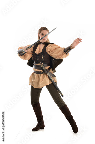 full length portrait of girl wearing brown medieval costume,. standing pose, isolated on white studio background.