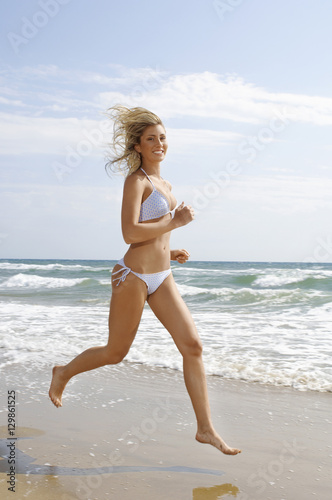 Full length portrait of happy young woman running at beach