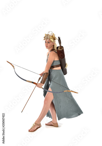 full length portrait of pretty blonde lady wearing fantasy toga gown, and holding a bow and arrow. standing pose on white background.