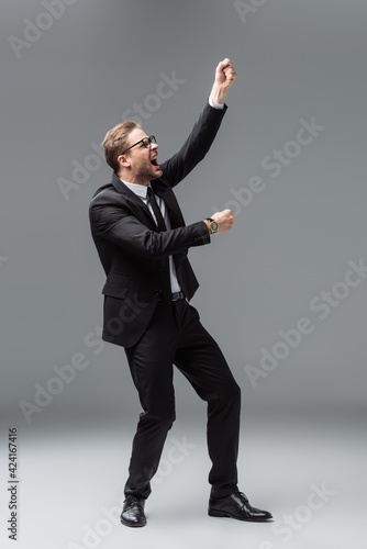 full length view of angry businessman with clenched fists screaming on grey