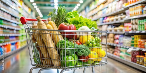 Full Shopping Cart of Fresh Produce in Grocery Store Aisle, supermarket, grocery shopping