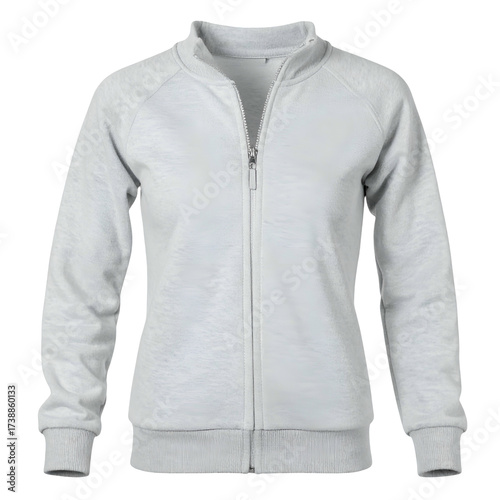 Full-length shot of a light grey zipped sweatshirt with a high collar and ribbed cuffs, captured against a plain black backdrop.