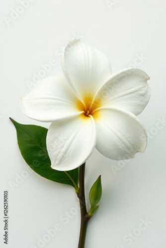 Fully opened gardenia flower, stark white, against plain white backdrop , plant, tropical flower