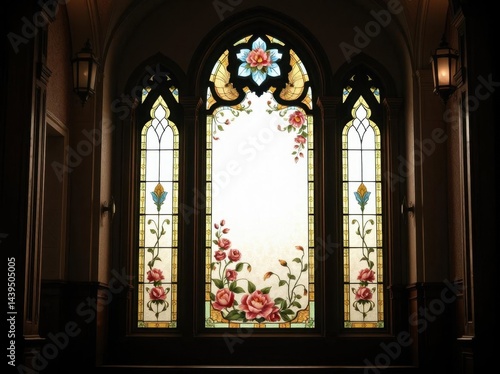 Funeral flyer design featuring delicate stained glass art with floral patterns and soft lighting