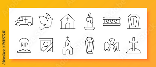 Funeral set icon. Church, coffin, angel, grave, candle, cross, tombstone, van, memorial, RIP, cemetery, faith, religion, ceremony, death, peace, mourning, heaven, soul, rest