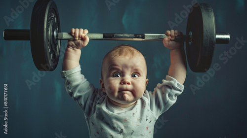 Funny baby lifts a heavy barbell over dark background