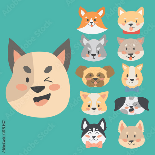 Funny cartoon dog character heads bread cartoon puppy friendly adorable canine vector illustration.