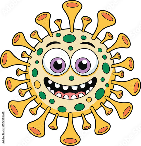Funny cartoon virus, yellow microbe illustration with big eyes, cute bacteria character for kids, pathogen education graphic