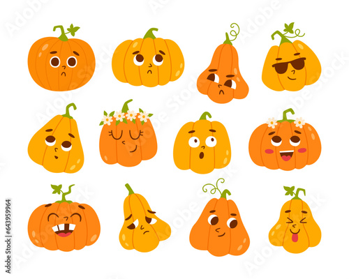 Funny cute pumpkin vegetable cartoon character with different emotion and expression isolated set