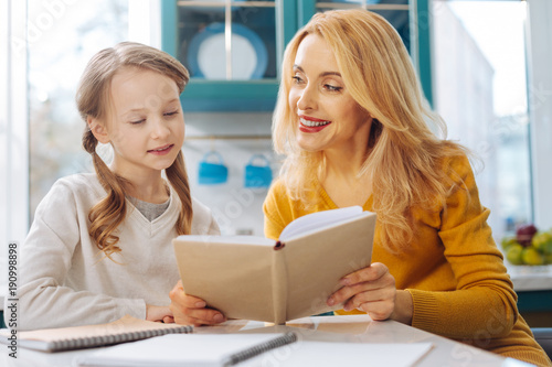 Funny reading. Pretty inspired blond slim mother smiling and looking at her daughter and while sitting at the table and her daughter reading
