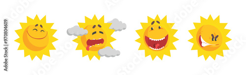 Funny Sun Character with Rays and Face Emotion Vector Set