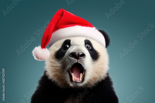 Funny surprised panda with santa hat studio shot isolated bright color background