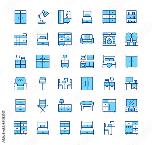 Furniture icons. Outline symbols. Vector blue line icons set