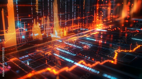 Futuristic 3D Holographic Market Data Visualization with Glowing Neon Lines and Bars