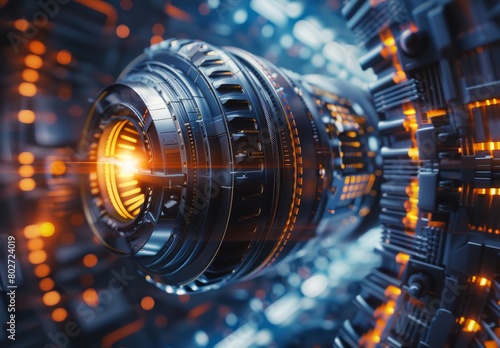 Futuristic 3D illustration of jet engine tech background. Engineering advancements