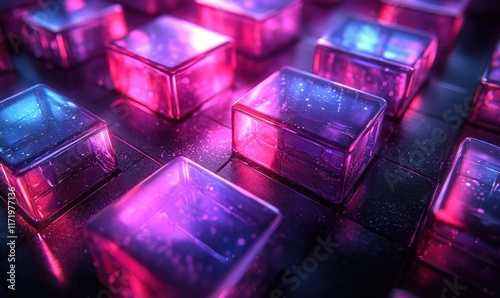 Futuristic Abstract Design with Translucent Glass Squares in Cool Blue and Purple Lighting