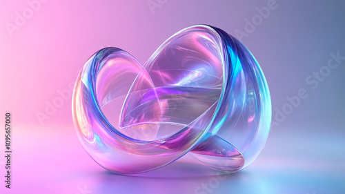 Futuristic abstract wave shape with an iridescent hologram effect, glass background.