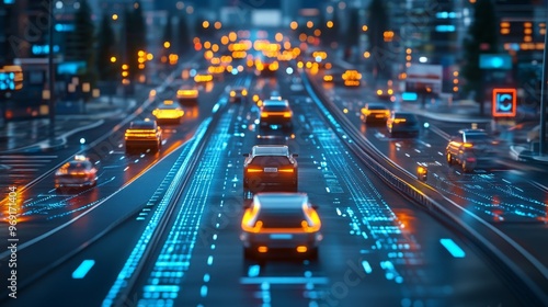 Futuristic AI-controlled road systems using smart traffic lights and autonomous cars: Highways and streets fully managed by AI for smoother, safer travel.