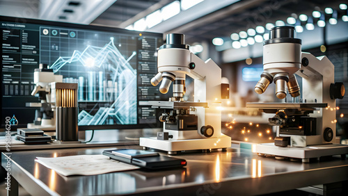 Futuristic AI-Powered Research Lab Scene, Innovation and Precision in High-Tech Environment with Holographic Data Displays - Stock Photo Concept