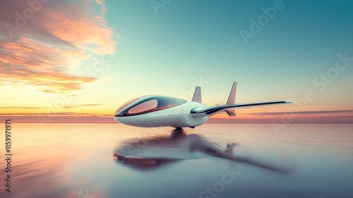 Futuristic airplane on a reflective surface at sunset.