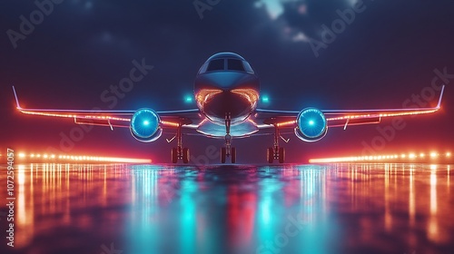 futuristic airplane with neon runway lights at night