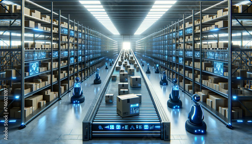 Futuristic automated warehouse interior with tall shelves stocked with boxes,robotic assistants on the floor,and a high-tech,glowing conveyor system under cool lighting.Logistics concept.AI generated.