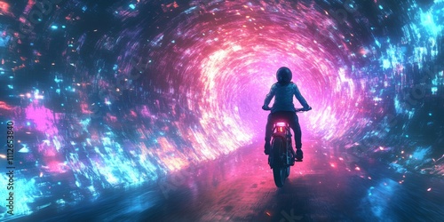 Futuristic biker navigating a luminous neon cityscape, vibrant colors contrasting with deep shadows, dynamic anime-inspired illustration