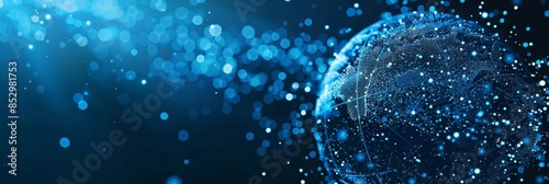 Futuristic blue background with a digital particle sphere on the left side, offering a modern design with free space