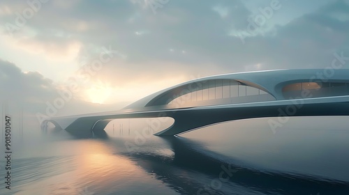 Futuristic Bridge spans a body of water at dawn with the sky painted in hues of orange and purple. The bridge is a marvel of modern architecture and a glimpse into the future.